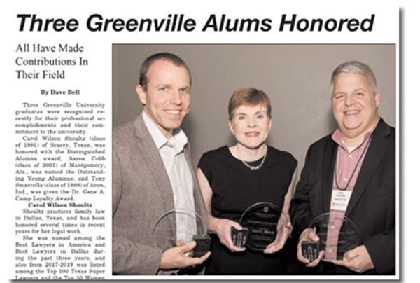At left, Carol is pictured in the Greenville Advocate with fellow recipients Aaron Cobb, who received the Outstanding Young Alumnus Award, and Tony Smarella, who received the Dr. Gene A. Kamp Loyalty Award.